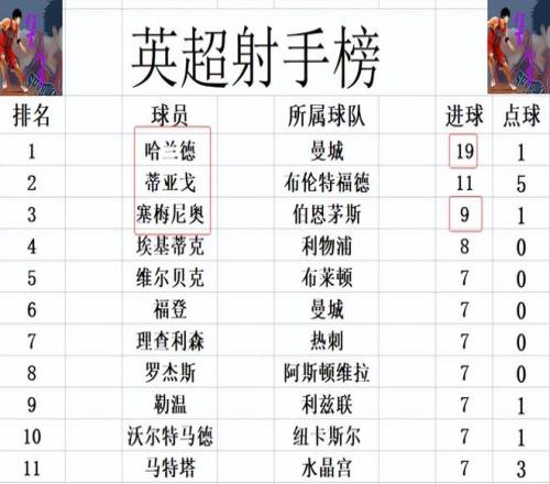 射手榜方面,哈兰德本轮哑火,还是19球高居榜首,比第2的蒂亚戈多了8球之多。塞梅尼奥破荒找回状态后,近几轮是连连进球,今天又打入一球的他超过埃基蒂克1球,9球独居第3。沃尔特马德,福登,理查利森等人7球刚好挤入前十。